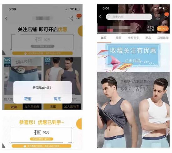 上面图片是一个店铺的首页,在首页的上方插入一个板块,写着收藏关注有优惠。点击后会跳转到左,选择是否关注店铺。关注点击确定就可以领取优惠券了。