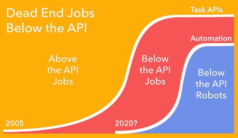 预计到2020年,人工智能广泛应用以后,API 之下的工作将急剧增加,API 之上的工作将急剧减少,未来的大部分工作岗位都是 API 之下的工作,大部分人都要接受软件的指令工作。同时,由于机器人越来越强大,会抢走一部分工作,以后想找一份 API 之下的工作恐怕也不容易。