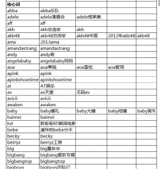 最后,通过VB工具,得出最终结果,同一个核心词都会显示在一列,那么这一列的关键词,我们就可以认为是相同词性的词,可以作为构成同一个标签(TAG)页。