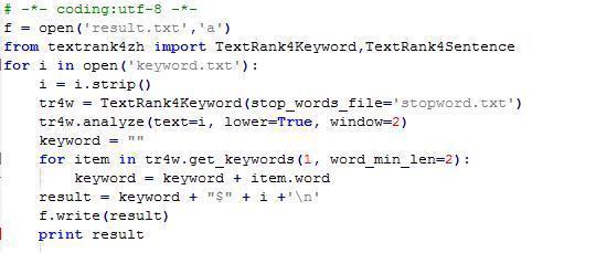 第三步,导出来的关键词肯定是有凌乱的,那么我们根据词性就行分类,选取每个关键词的核心词,这里需要借用Python的第三方库textrank4zh,代码参考如下: