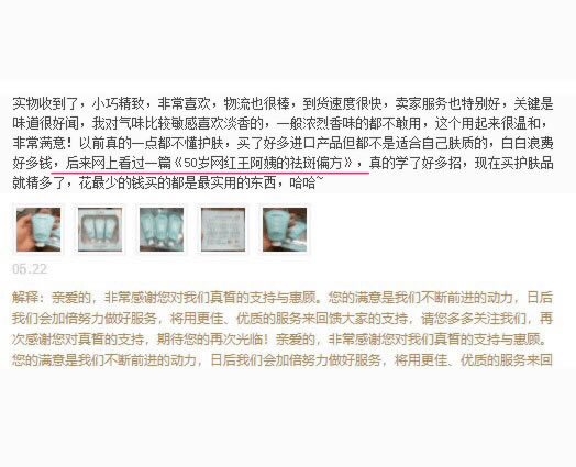 大家看明白没有,你推荐的这篇《50岁网红王阿姨的祛斑偏方》,其实就是你上面发布在博客上的那篇文章,那么当这些浏览“商品评价”的用户看到这条评价的时候,就会去百度搜索这篇文章,自然而然的就被我们的文章引流过来了。