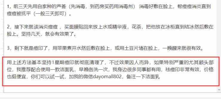 所以意思看懂了没?取一个养生、护肤、美食、瘦身、购物等相关的标题,进而用与此标题相关的一些生活偏方、生活小技巧作为文章内容,免费、毫无保留的分享给别人,到最后一步,引导加微信: