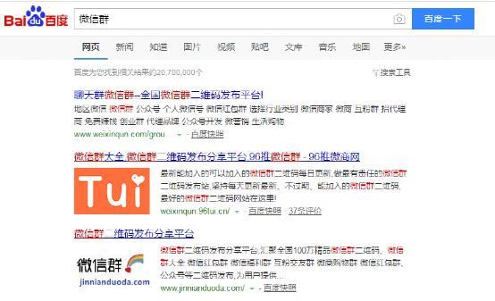 第一步,在百度上直接搜索“微信群”,会出现一堆加群的网站,然后点击进去。