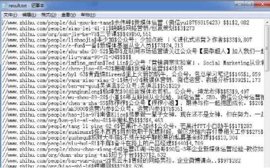 第九,运行结束后,回到zhihu文件夹,你就会发现原先空的result.txt会出现一些数据,把这些数据丢到Excel整理一下,以“$”作为分隔符,最终整理的数据如下图: