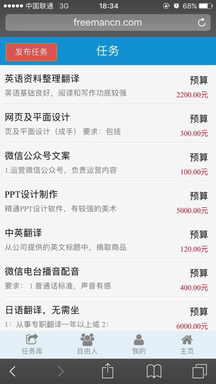 这个网站上的需求是比较靠谱的,里面任务有难有易,除了一般的接文写作,还有ps,翻译,设计等,我觉得给的报酬还是相当合理的,大家没事可以翻翻有没有适合自己的。