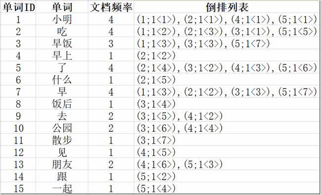 上图是比较复杂的,我们来看看文档频率为多个文档包含这个单词,如:“小明”在“4个文档”中出现了。“吃”在“4个文档”中出现了,后面的以此类推。倒排列表小明 (1;1<1>),1为文档1,中间的1为这个词在这个文档中出现的频率,<1>是这个词在文档中出现的位置1,即在文档中第一个词。