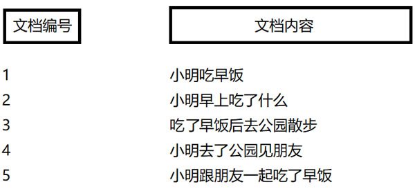 上图是每个文档编号对应的不同文档,如编号“1”对应“小明吃早饭”,编号“2”对应“小明早上吃了什么”,以此类推。