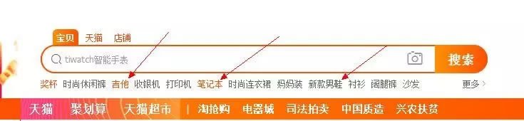 1.搜索框下面红色的字。先看图,打开某宝就可以看到的: