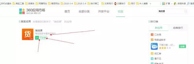 接着,会出现360应用市场,在下图箭头处搜索“淘货源”,插件就会出现了:
