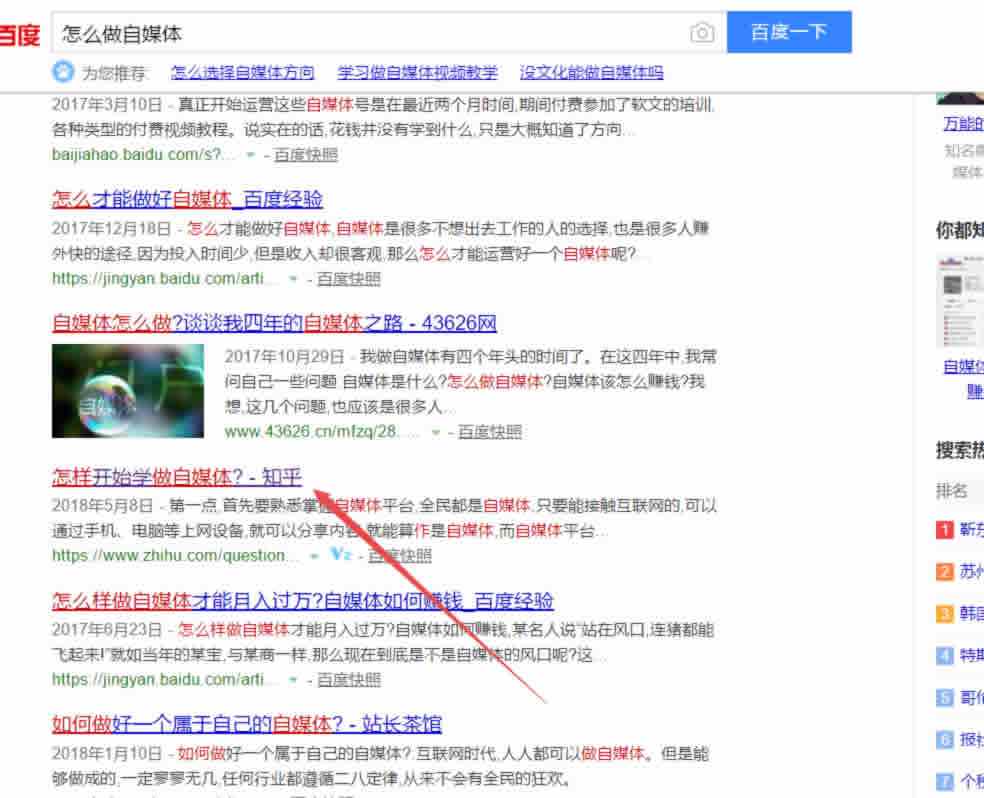 我们通过搜索,可以很直观的看出来,每个不同话题的关注人数和热度,我们点击“自媒体”进入,看圆圈指示方向: