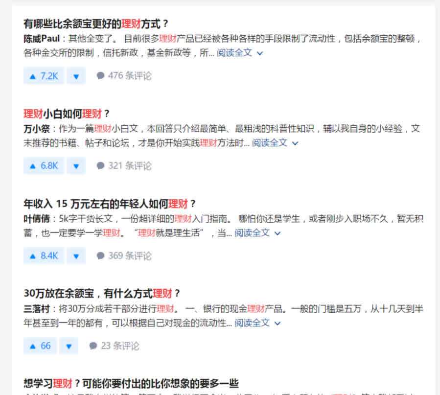 以关键词“理财”为例,在知乎内搜索: