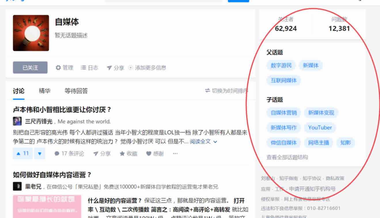 关注人数比较直观,重要的是这个父子话题,这是个包含与被包含的关系,我们在这里优先选择的是子话题,因为父话题还会涵盖其他领域的内容,所以并不精准。