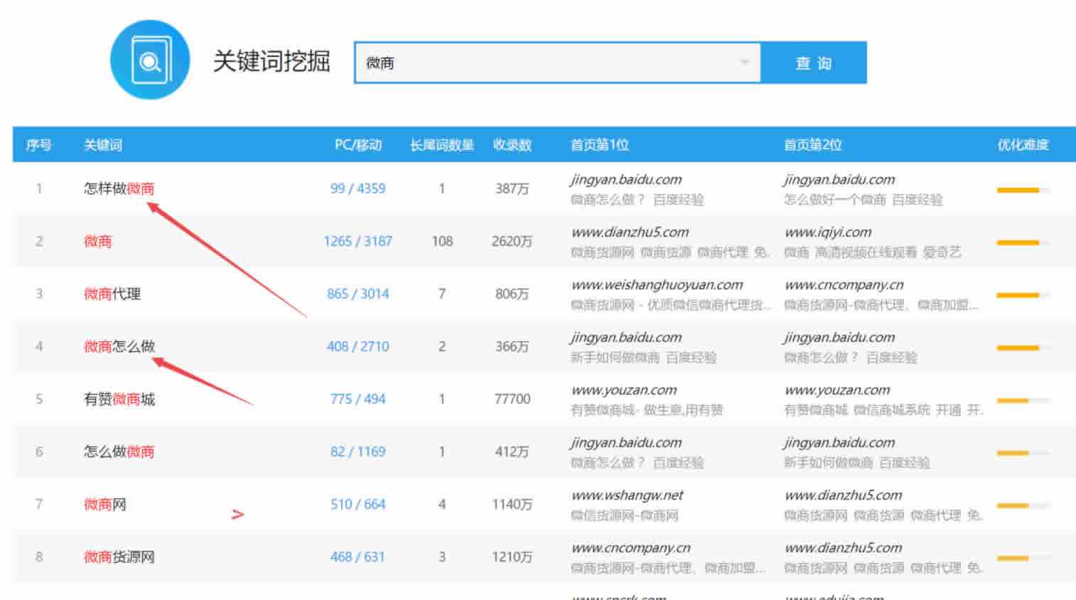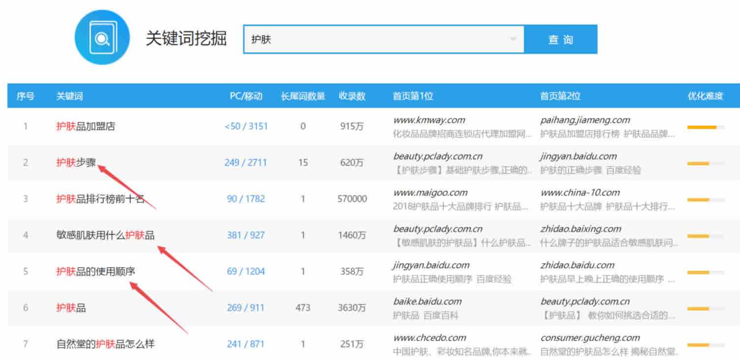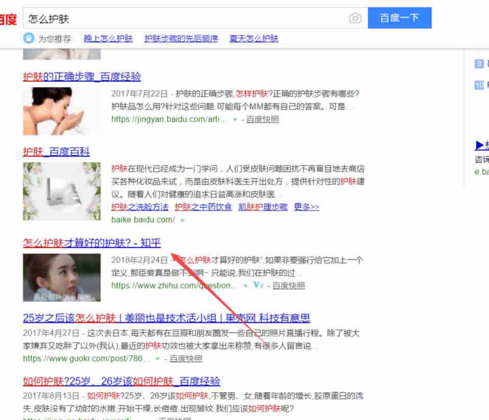 看我打箭头的关键词就懂了,用户很少有直接搜索“微商”或者“护肤”关键词的,而往往是带有疑问句的进行搜索,好比下图: