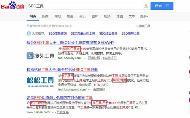 另外从图上我们也可以看到分词组合后得到三个价值词SEO、SEO工具、工具,这些词都是会被百度建立索引参与排名的重要因素,下图是我从百度搜索结果截图的。