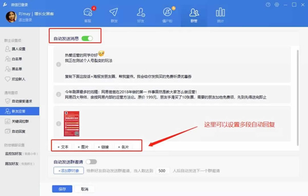 步骤:【群管】-【自动回复】,可设置关键词回复,自动发送福利