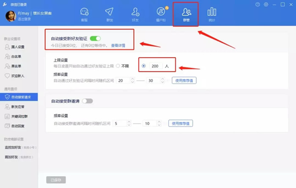 步骤:【群管】-【自动接受请求】-【自动接受新好友验证】,推荐使用官方推荐的200人上限设置和频率设置