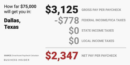 扣税最少的达拉斯每半个月比扣税最多的纽约多拿268美金(1780元),相当于每个月多拿536美金(3560元),每年多拿6432美金(4.27万元)。现在明白,为什么那么多人往德州搬了!