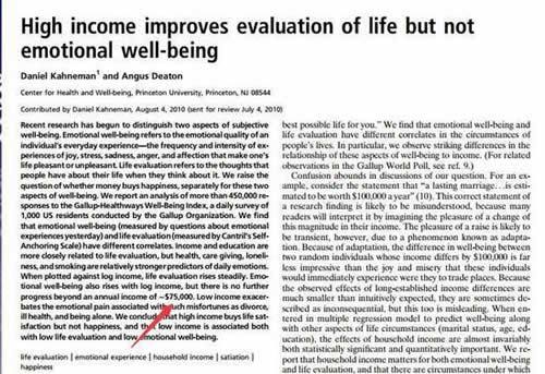 根据普林斯顿大学2010年的一项调查研究显示,美国人的幸福指数和收入有关,但当年收入到达7.5万美金这个峰值后,幸福度和收入不再相关。所以,Business Insider选择了7.5万美金作为衡量标准。
