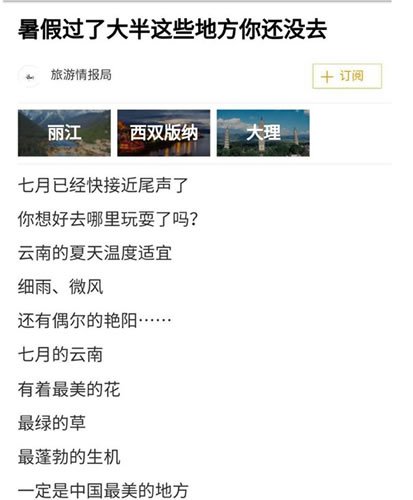 就已飞猪旅行这篇文章为例,通过优美景色的描述加上实地拍摄的景色图片,来进行旅行的宣传。看标题,“暑假过了大半”,让读者明白,现在还有时间,去旅行还来得急;“这些地方你还没去”给读者列举出当下适合旅行,平常又没时间去的地方,在暑假这个阶段正适合。