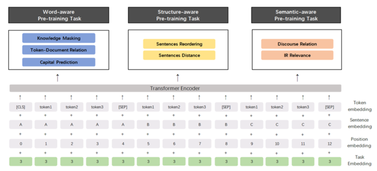 然而除了共现之外,训练语料库中还包含语法、语义信息等更多有价值的信息。例如:命名实体(名称、位置和组织),则可以包含概念信息、句子之间的顺序和距离关系等结构知识;而文档层面的语义相似性或句子之间的话语关系,则能够训练模型学习语义感知表示。假设模型能够经过训练从而不断学习更多类型的任务,是否这样可以进一步提高模型的效果呢?