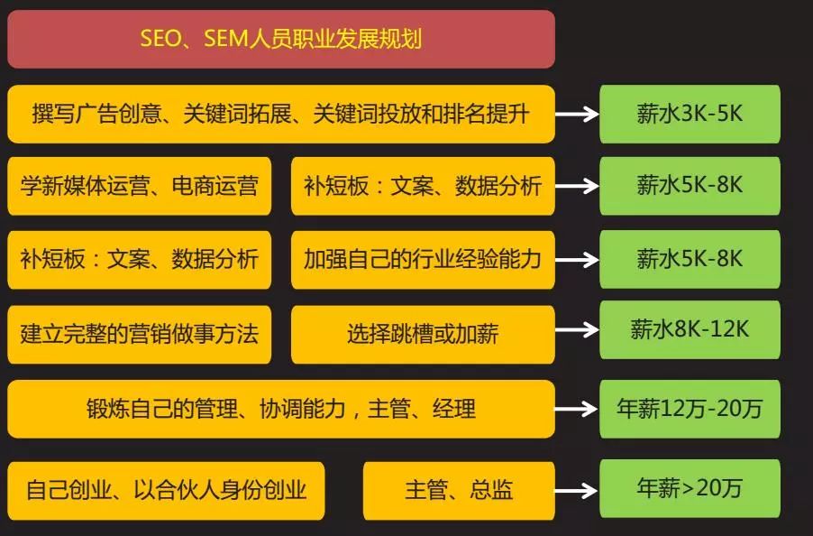 SEM和SEO人员的职业发展,做的好的人很值钱,人数也会非常少。因为这些领域更加垂直。
