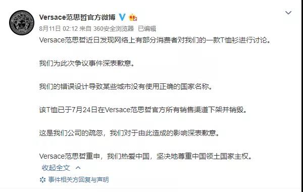 范思哲在杨幂发声明之后十几分钟后迅速做出回应,在Versace范思哲官方微博发文致歉,表示:“我们的错误设计导致某些城市没有使用正确的国家名称。该T恤已于7月24日在Versace范思哲官方所有销售渠道下架并销毁。”