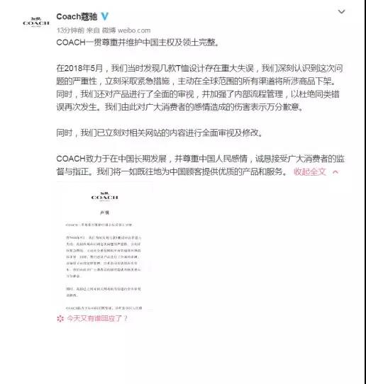 12日,Coach在其官方微博道歉,称Coach一贯尊重并维护中国主权及领土完整。