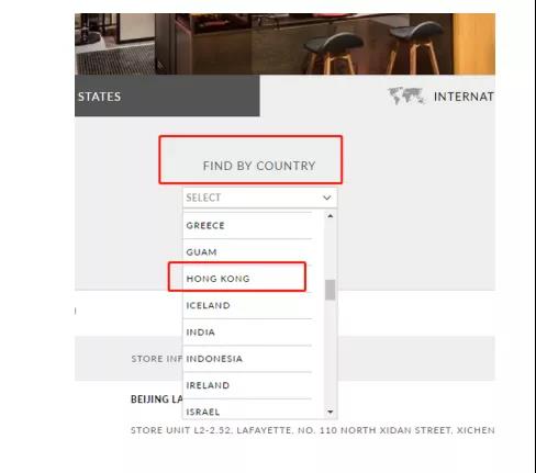 更过分的是,coach不单单只是一款衣服出了问题,在Coach官网上搜索门店时,其显示为find by country(“按国家查找”),在下拉栏中赫然显示着香港,澳门和台湾三个地名,并与中国和美国等国家并列。