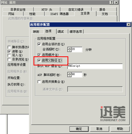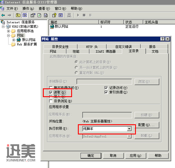 再点击“主目录”选项卡,勾选“读取”,在执行权限处选择“纯脚本”,如下图: