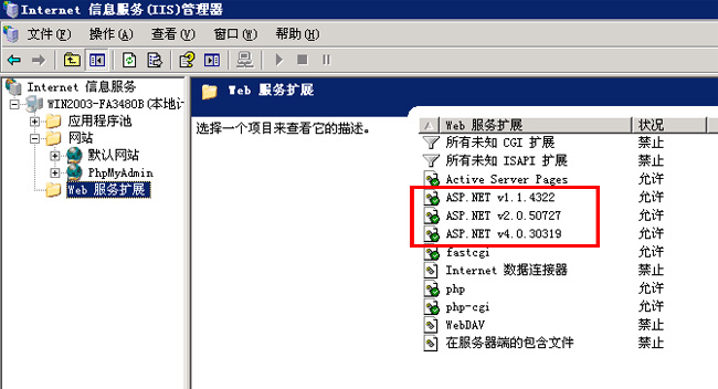 然后在IIS的“Web 服务扩展”,将ASP.NET相关的几个扩展组件都点为“允许”。如下图: