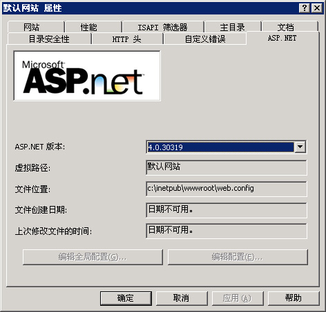5:安装Microsoft .NET Framework 4.0后,在IIS的站点中的“ASP.NET”选项卡的ASP.NET版本选择中会有4.0.30319的选择。如下图: