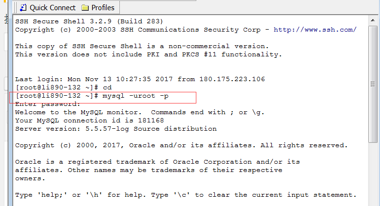 其实大多时候我们可以直接通过后台数据库面板上传数据库文件,但是有时候往往会上传大数据库文件,发现后台上传的方式不行,不得已只能用SSH的命令形式上传数据库文件,首先打开SSH软件:先登录好,然后输入命令:mysql -uroot -p 如软件所示:会提示你输入数据库密码,输入即可!