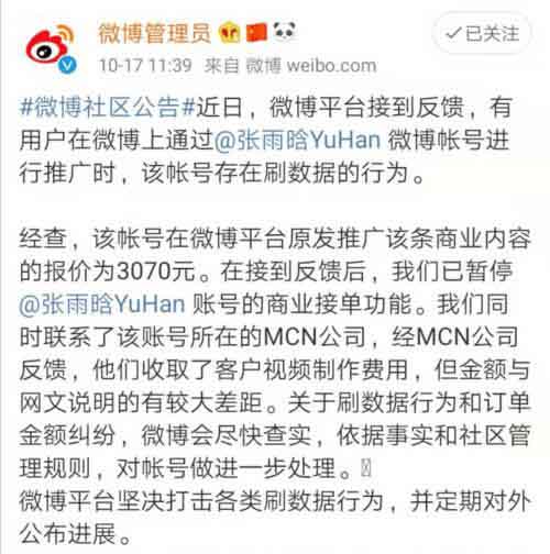 最后,随着事情越发热闹,微博也对此事件作出了回应,表示微信控诉文章中投诉的“账号却是存在刷数据行为,而且存在拉高价的行为,目前已暂停其商业接单功能。”