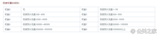 谷歌对于网站的每个页面(PR)和关键词都有评价,但百度对关键词较为情有独钟,尤其是包含有百度指数的词,这个指数便是网民整体行为数据经过统计分析后,呈现出近期公众关注的关键词搜索数和关注趋势。而正如前文提到的它仅是SEO权重构成的一部分,站点排名与关键词排名也不是直接关系,网站Weight是综合多方面因素评估出的结果,其每个等级预计流量从低到高也有很大的差距,如下所示进行适当参考。