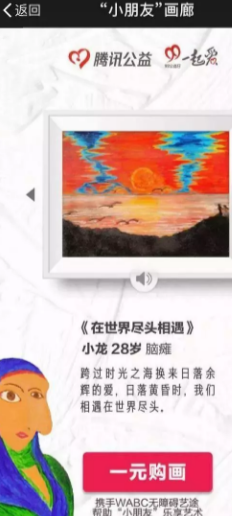 活动展示了患有自闭症、脑瘫、唐氏综合征等小朋友的画作,用户可以支付1元(或其它金额)购买喜欢的作品,所有的款项将支持“艺术点亮生命”项目,帮助精智力障碍的特殊群体融入社会。