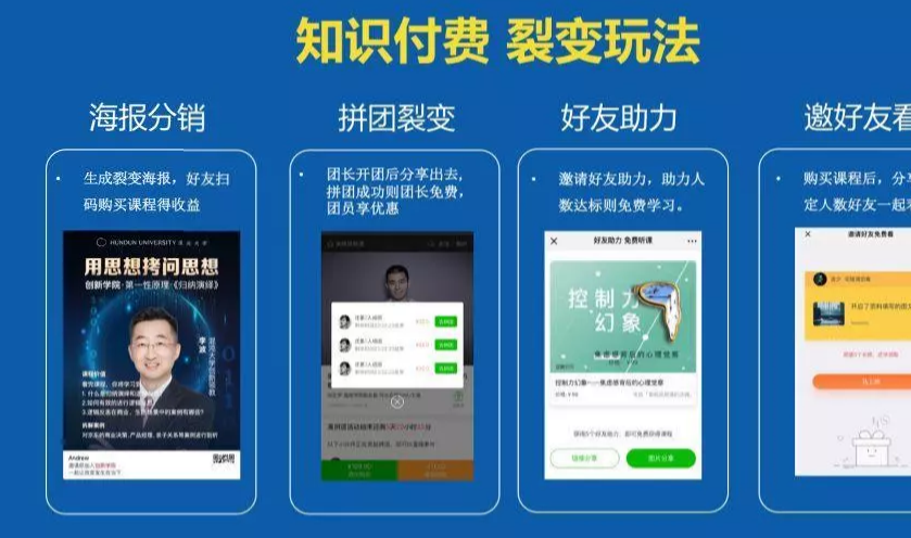 知识付费常见裂变营销玩法:海报分销、拼团裂变、好友助力、邀好友看等。