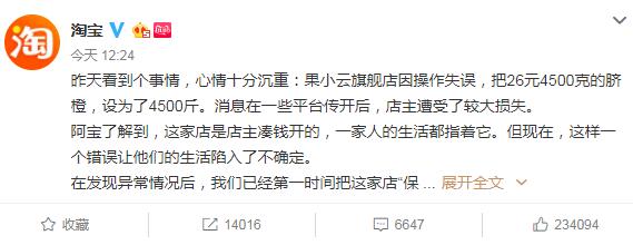 昨天看到个事情,心情十分沉重:果小云旗舰店因操作失误,把26元4500克的脐橙,设为了4500斤。消息在一些平台传开后,店主遭受了较大损失。