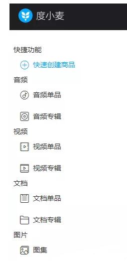 4度小麦的后台,分别有创建商品、支持音频、视频、文档、图档等内容商品