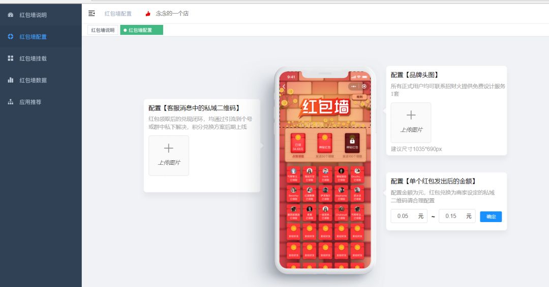 点击界面左侧菜单栏中的红包墙配置即可进入红包墙创建页面,其中的场景和元素可以换成自己品牌相关的产品和元素,植入品牌信息,增加曝光率。
