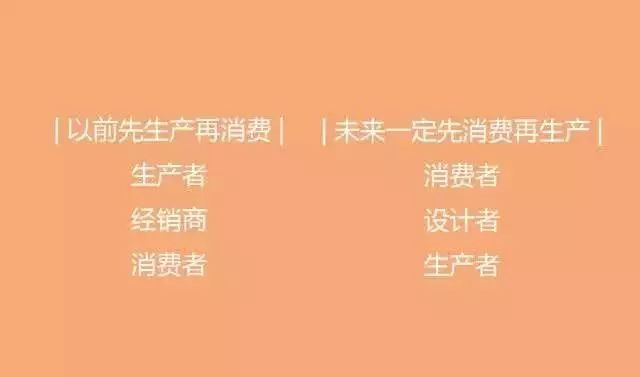 以前是商家生产什么,消费就得去买什么。现在是消费者需要什么,生产者就得生产什么,整个供应链都在被逆向打通,直到最好实现按需生产,每一件产品在生产之间都知道他的消费者是谁!