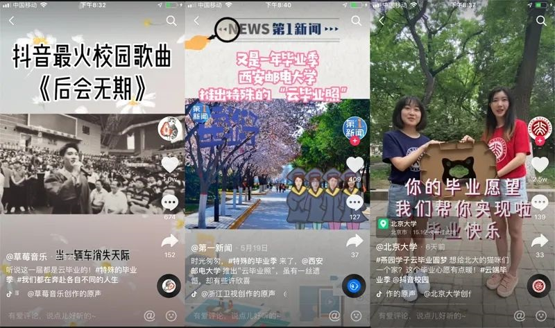 6 月 11 日,央视新闻、抖音联合包括北京大学、清华大学、武汉大学在内的百所高校,共同发起了 “云端毕业季”活动,通过云毕业典礼、云毕业联欢会、高校挑战赛、知名校友直播、毕业季歌单等一系列内容,弥补毕业生们的遗憾。