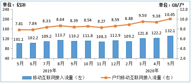 工业和信息化部运行监测协调局发布的《2020 年 1-5 月通信业经济运行情况》显示,我国移动互联网流量保持较快增长,5 月户均移动互联网接入流量超 10GB / 户。