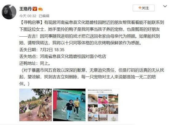 演员王珞丹在凌晨发布了一则启示,寻找在河南息县丢失的宠物鸭吉吉,并愿意以十只同等体格的北京烤鸭保鲜装作为感谢。