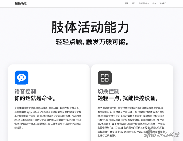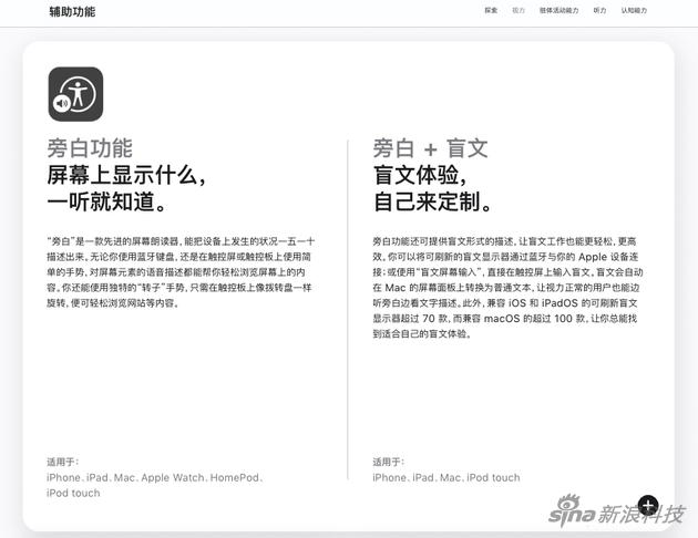 其实这样的例子还有很多,在今日更新的 “辅助功能”介绍页面中,苹果官方梳理并更加明确了他们为视觉、听觉、触觉等障碍的使用者提供更加人性化的功能。