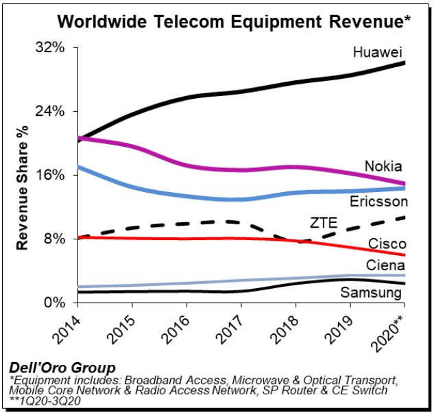 由于中国市场的投资超过了整体市场,Dell'Oro 估测,华为和中兴通讯在 2019 年至 2020 年前三季度期间合计获得了大约 3% 的收入份额,两家公司占据了全球电信设备市场超过 40% 的份额。