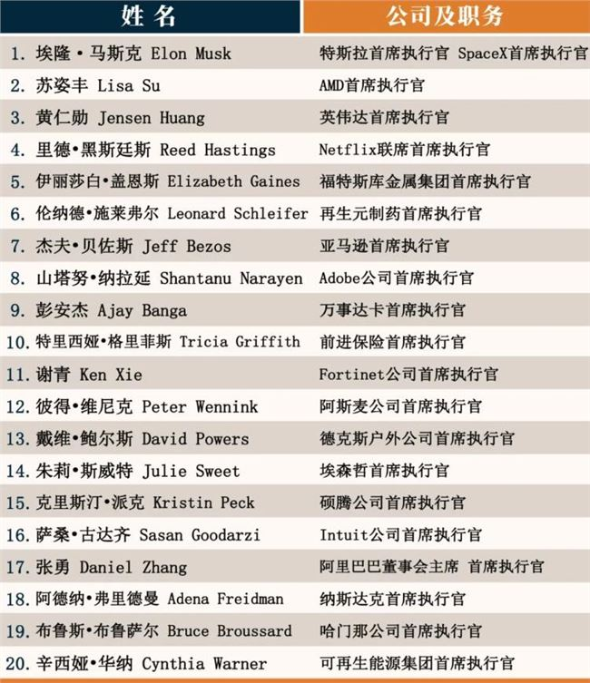据榜单显示,特斯拉CEO马斯克排第一、AMD CEO苏姿丰排第二、英伟达CEO黄仁勋排第三、亚马逊CEO贝佐斯排第7、阿里巴巴CEO张勇排第17。