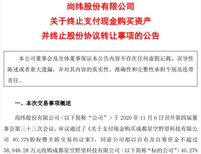 12月3日晚间,尚纬股份突发公告称,终止支付现金购买成都星空野望科技有限公司40.27%股权。值得关注的是,这一笔看似板上钉钉的收购突然终止,与近段时间直播电商迎来强监管有着直接关系。