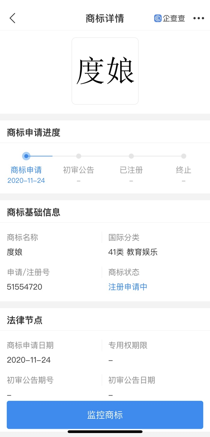 4日消息 企查查 App 显示,近日,百度在线网络技术(北京)有限公司申请多条 “度娘”商标,国际分类包含广告销售、通讯服务、教育娱乐、科学仪器等,商标状态均为 “注册申请中”。申请日期为 2020 年 11 月 24 日。