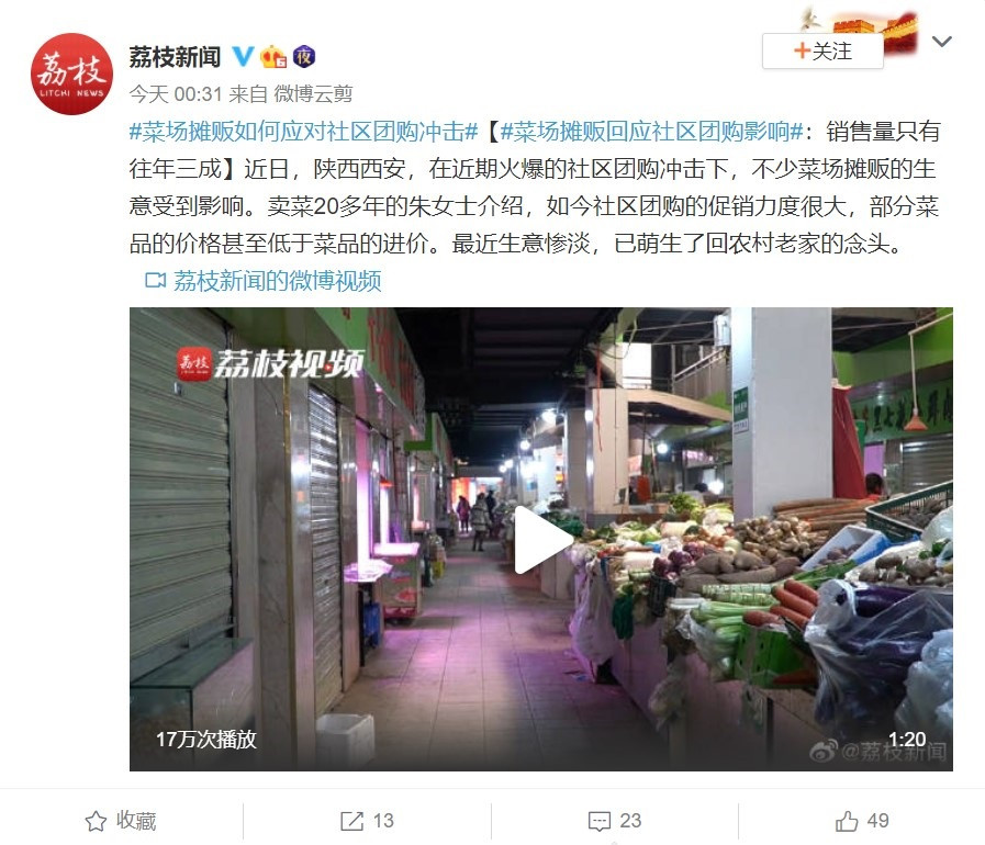 据江苏广电荔枝新闻报道,陕西西安一菜场摊贩朱女士介绍,如今社区团购的促销力度很大,部分菜品的价格甚至低于菜品的进价,对零售影响极大。以前大部分菜品都供给到饭店,今年行情不好,只能靠零售。以前一天最低(营业额)都是一两千,现在一天只能卖三四百元,几乎差了三分之二。最近生意惨淡,已萌生了回农村老家的念头。