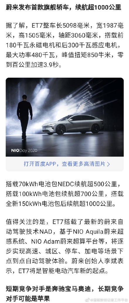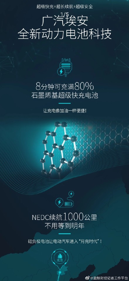 事实上,近期,1000公里续航里程是新能源汽车行业的关注焦点。1月15日,广汽埃安发布的海报上称,其搭载石墨烯基超级快充电池的车型8分钟可充电80%,NEDC标准续航里程达到1000公里;1月13日,智己汽车宣布旗下首款车型与宁德时代(380.550, 11.54, 3.13%)开展合作,搭载“掺硅补锂”电池,最大续航里程将超过1000公里;1月9日,蔚来(NIO)发布150kWh固态电池,称搭载该电池的车型,NEDC续航可达到1000公里。